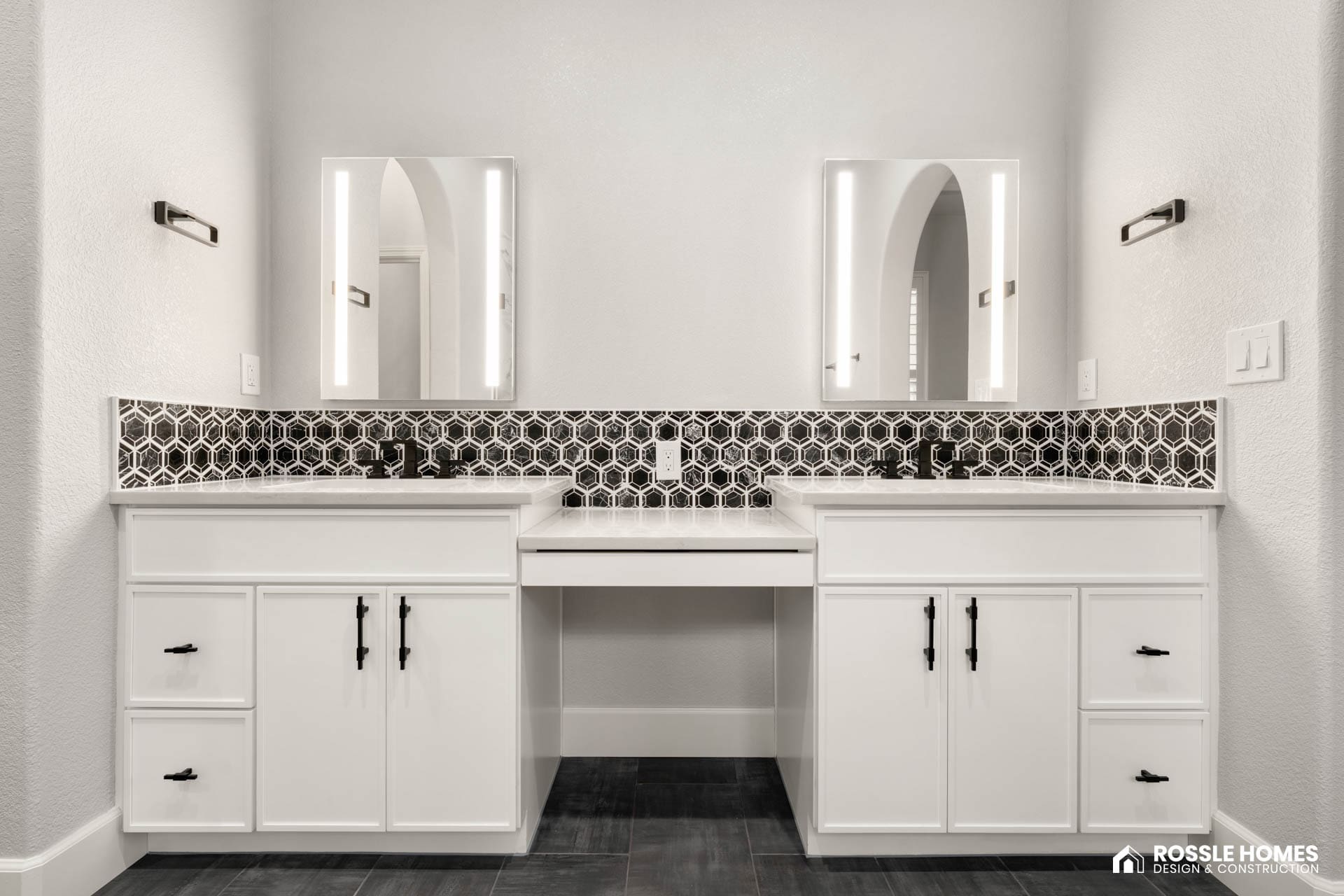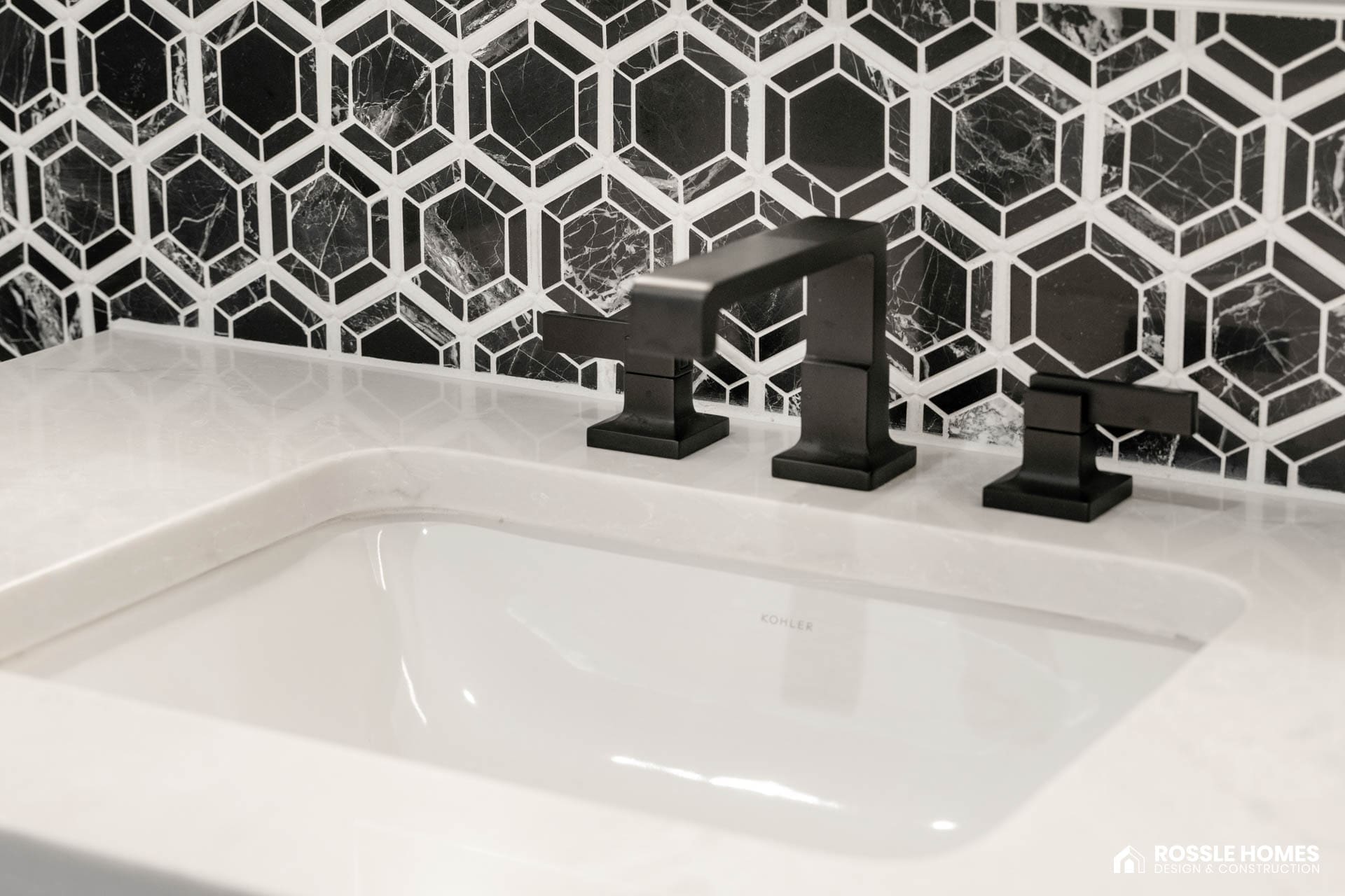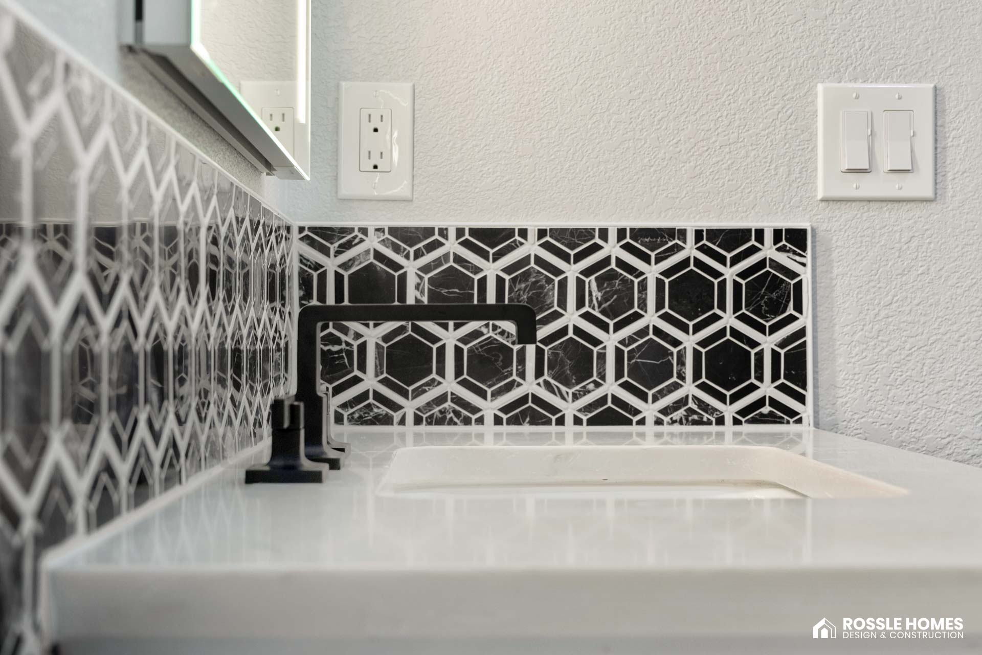 - Custom slim-white shaker vanity with geometric hex backsplash tile and a gray quartz countertop
