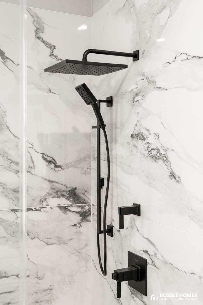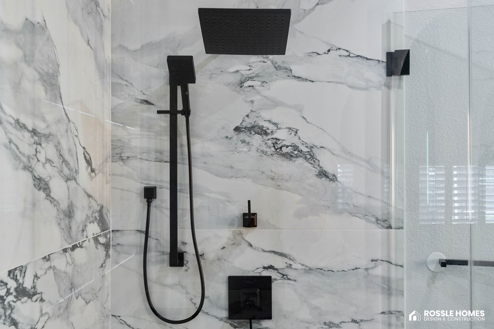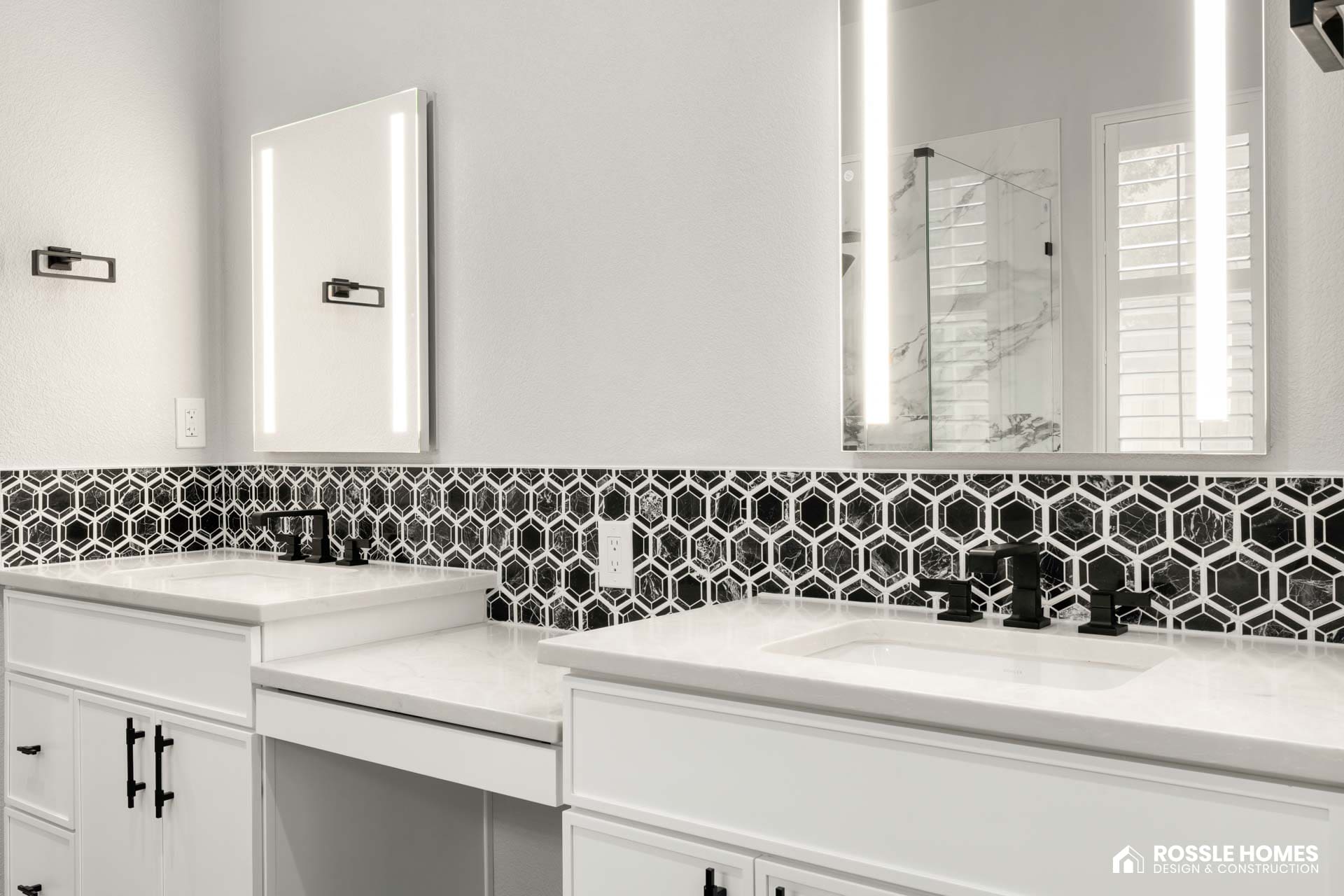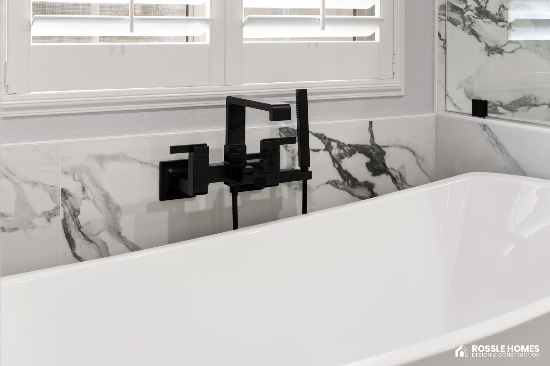 Rossle Homes transformed her dated oak-and-green bathroom into a sophisticated black-and-white space that feels bright and luxurious. The new design combines bold matte black fixtures with high-contrast finishes and sleek lines for a timeless modern look.