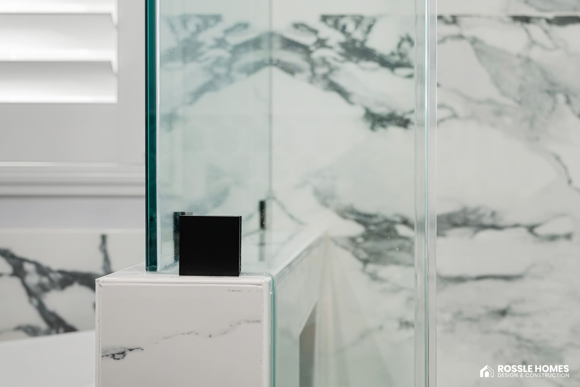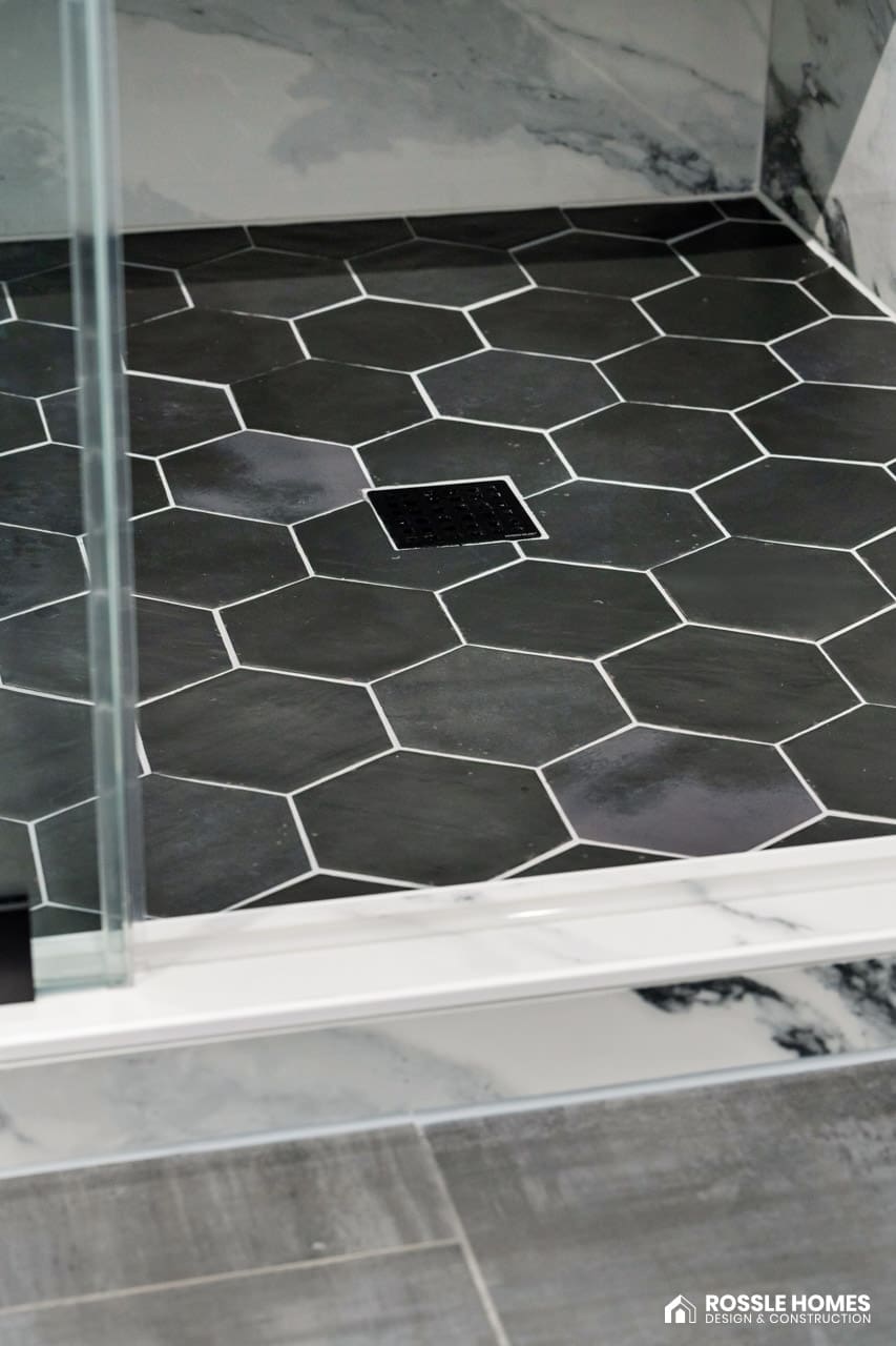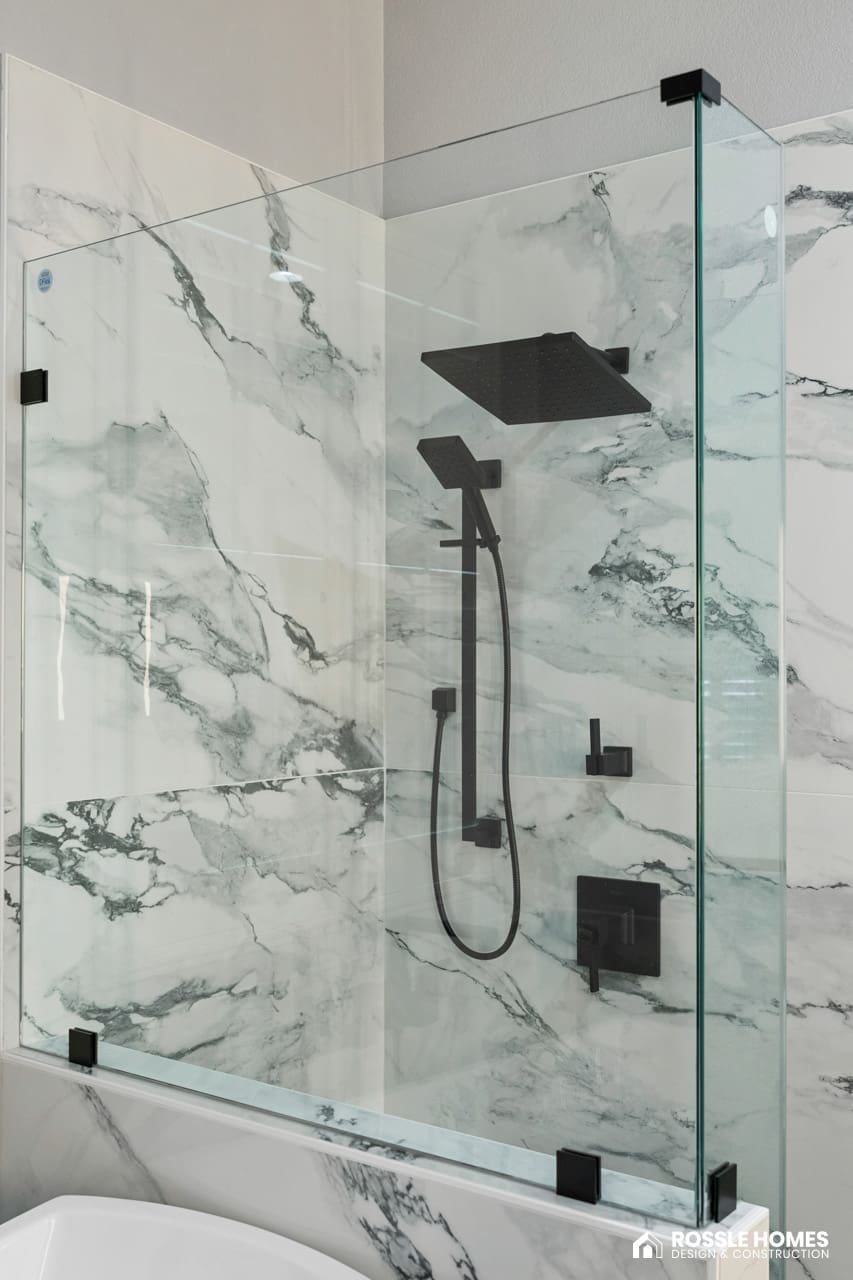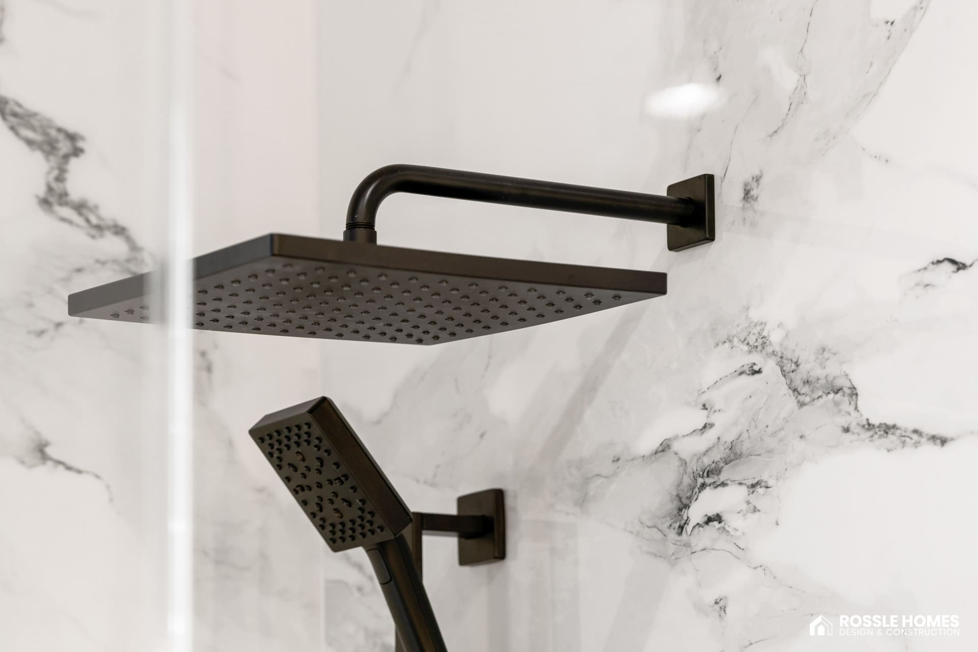 Rossle Homes transformed her dated oak-and-green bathroom into a sophisticated black-and-white space that feels bright and luxurious. The new design combines bold matte black fixtures with high-contrast finishes and sleek lines for a timeless modern look.