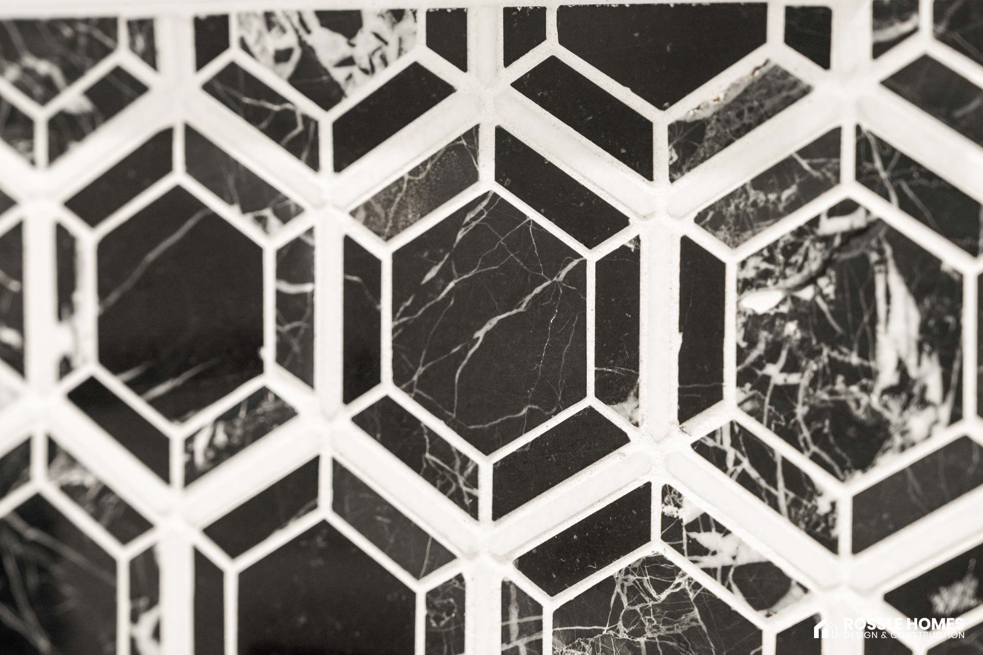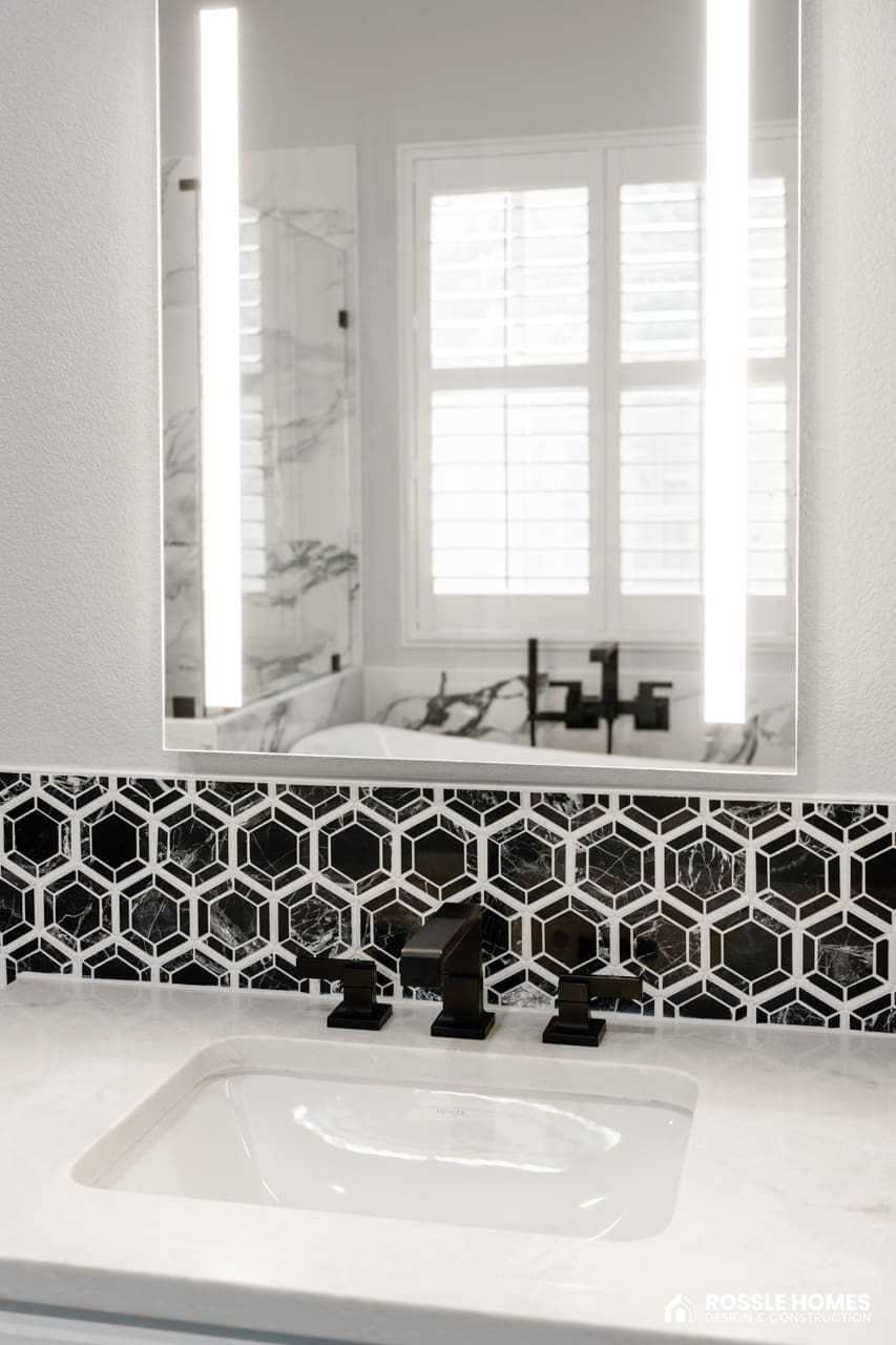 Every element of this remodel was designed with functionality and visual flow in mind. The freestanding tub anchors the room as a centerpiece, while the full-height shower surround creates a seamless connection between the wet area and vanity wall. The black fixtures and geometric tile bring a bold designer touch, perfectly balanced by soft white cabinetry and natural light from the large window.