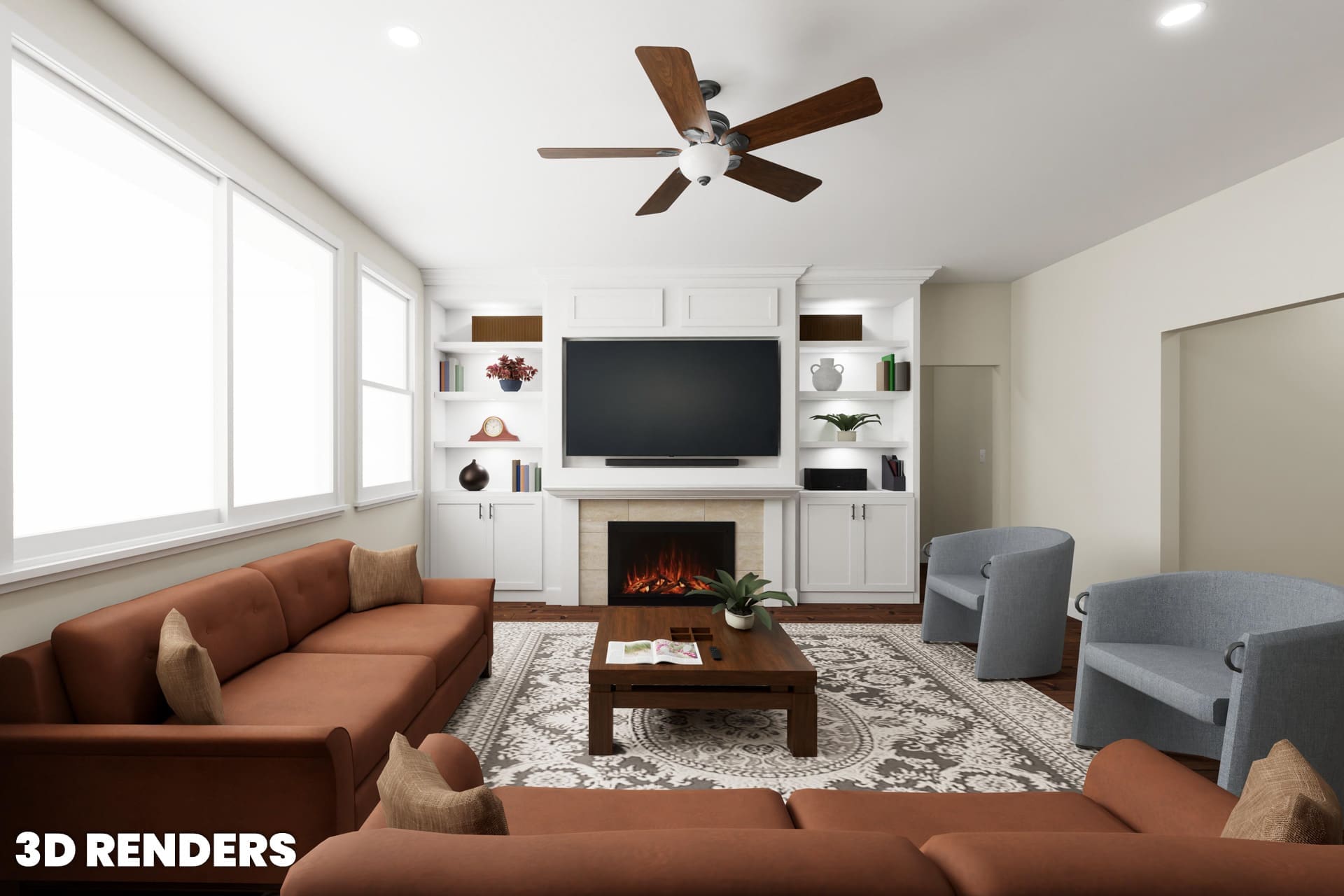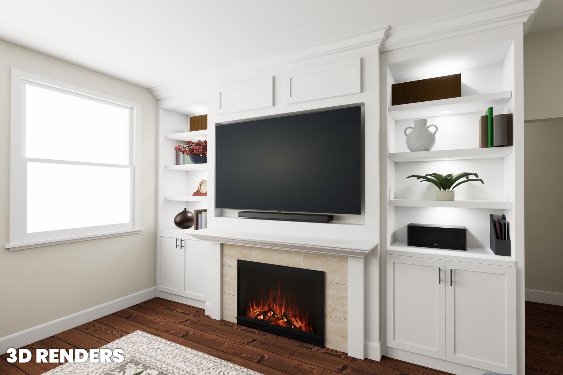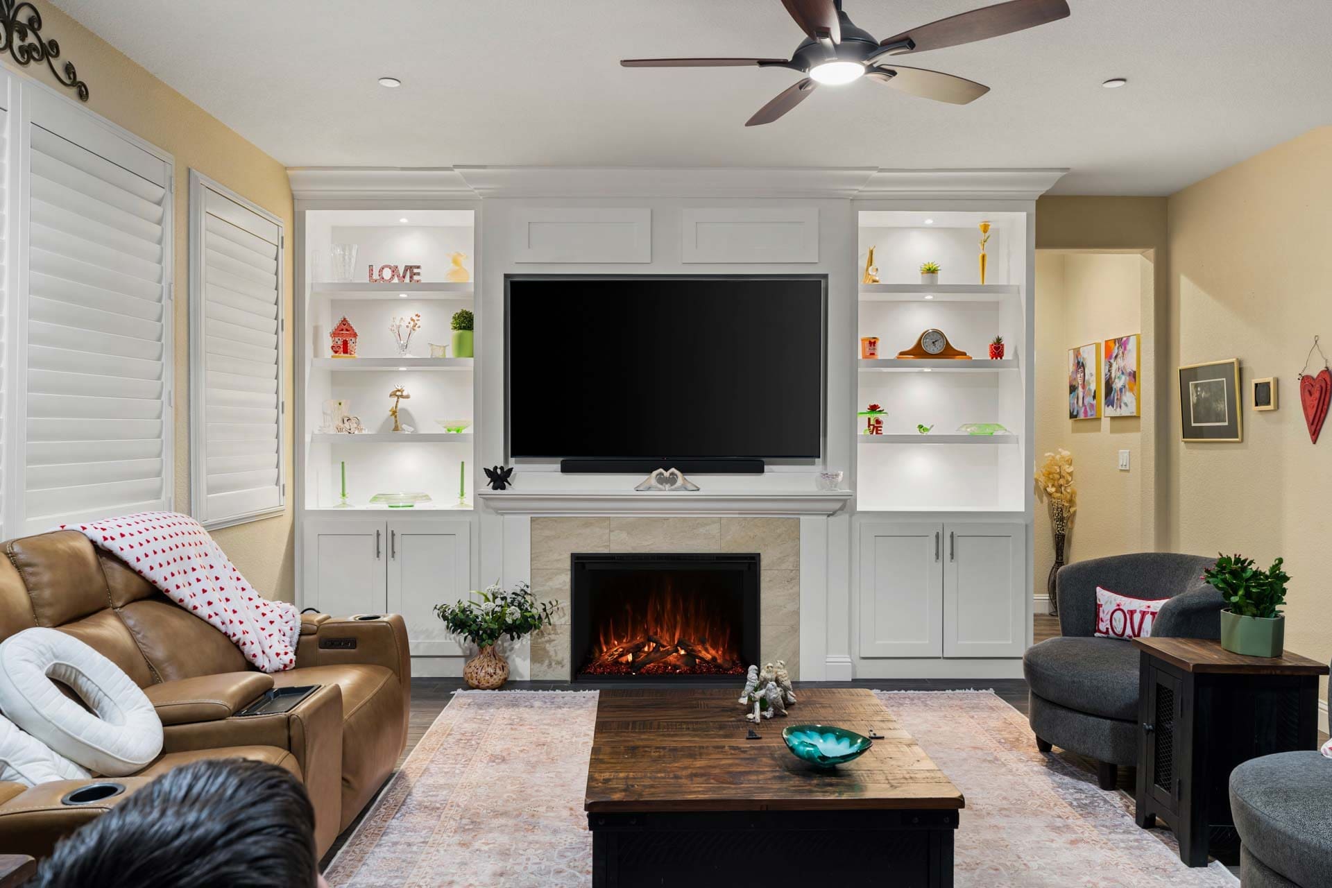 This project included a full fireplace build out with white shaker cabinets, open shelving, integrated lighting, and a high performing electric fireplace. From design to installation, every detail was planned in advance so the remodel could move quickly and smoothly.