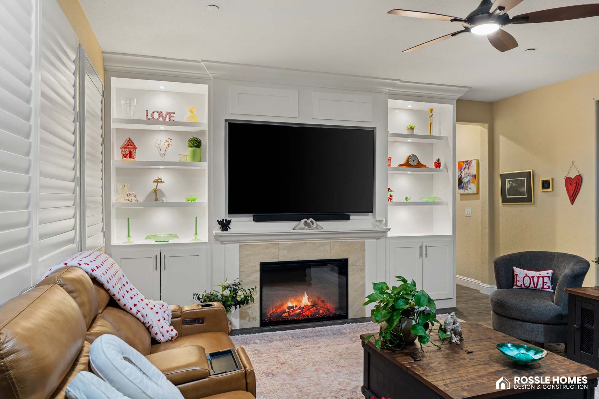 Darla reached out to Rossle Homes because she was tired of looking at a blank wall during movie nights and gatherings. She had a clear vision from the start. She wanted white cabinets, open shelving, integrated lighting, and very minimal decorative elements.